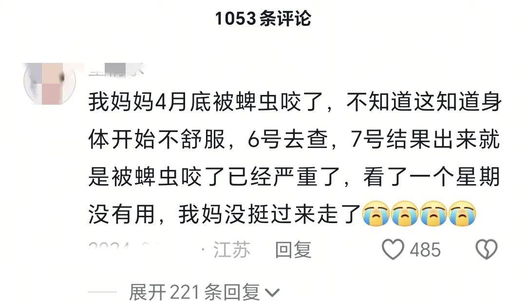 然后一個網友說自己的媽媽在4月底被蜱蟲咬了,一個星期這樣就去世了。